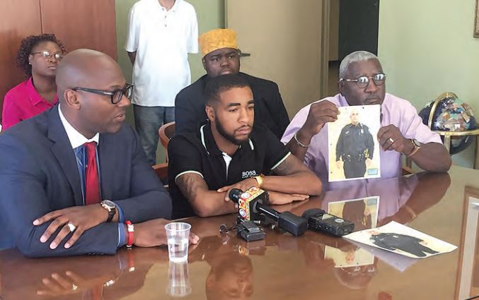 (From left to right) Attorney J. Wyndal Gordon, Aaron Winston and Edward Winston, holding a picture of the police officer who allegedly hurt Winston, and the Rev. Cortly ‘C.D.’ Witherspoon (back) at a news conference announcing Aaron Winston’s acquittal on Aug. 17. (Photo by Maliik Obee)