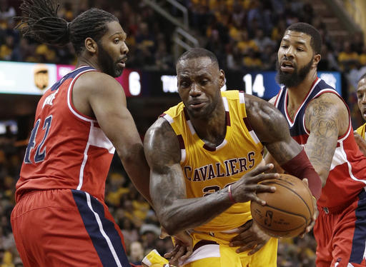 Cleveland Cavaliers’ LeBron James, center, drives between Washington Wizards’ Nene Hilario, left, from Brazil, and Markieff Morris in the second half of an NBA basketball game Friday, March 4, 2016, in Cleveland. The Cavaliers won 108-83. (AP Photo/Tony Dejak)