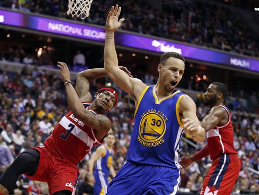 Golden State Warriors guard Stephen Curry (30) reacts after a goaltending call on Washington Wizards guard Bradley Beal (3) during the second half of an NBA basketball game Wednesday, Feb. 3, 2016, in Washington. The Warriors won 134-121. (AP Photo/Alex Brandon)