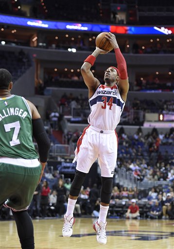 Washington Wizards forward Paul Pierce (34) takes a shot against Boston Celtics forward Jared Sullinger (7) during the first half of an NBA basketball game, Monday, Dec. 8, 2014, in Washington. (AP Photo/Nick Wass)